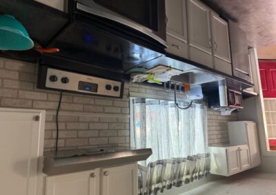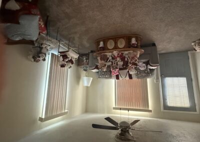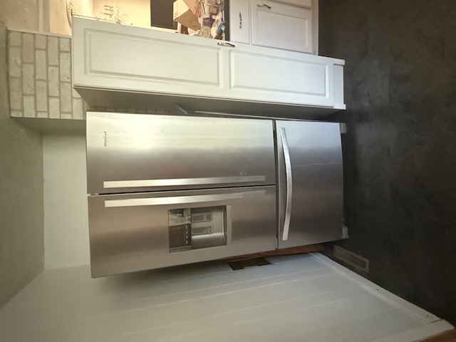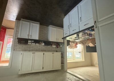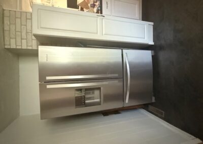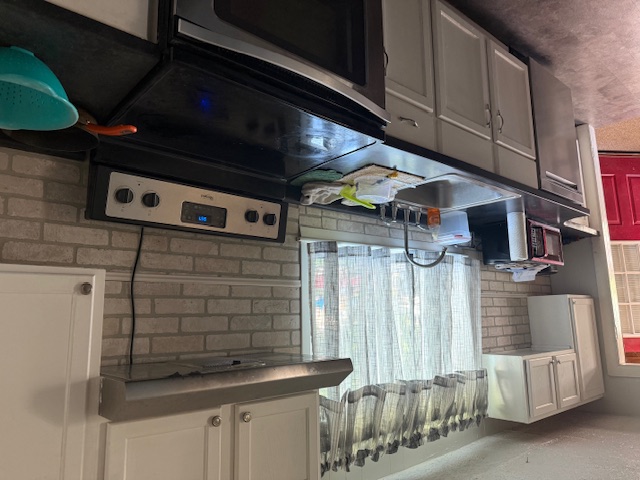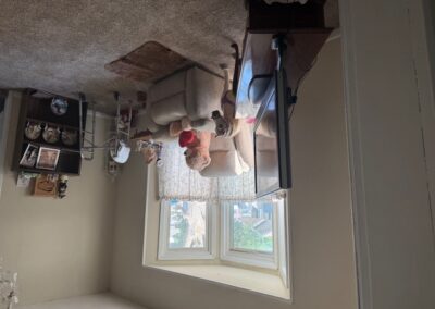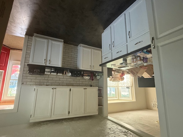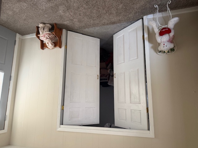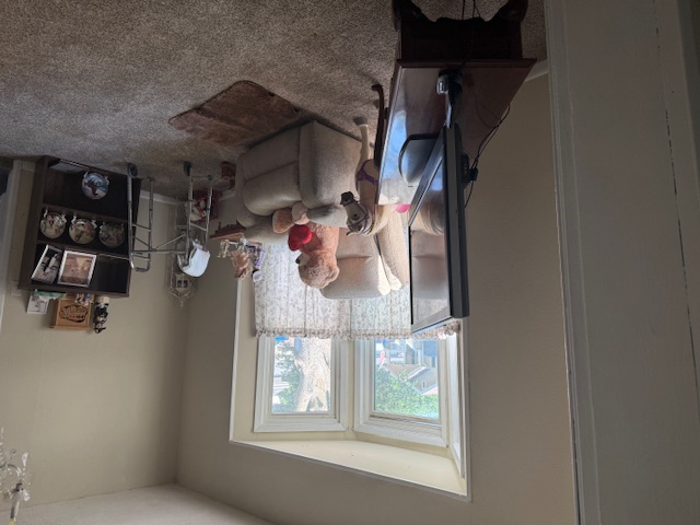 Mixed Floor Coverings in the living room and kitchen area–carpet & linoleum.