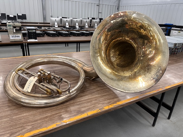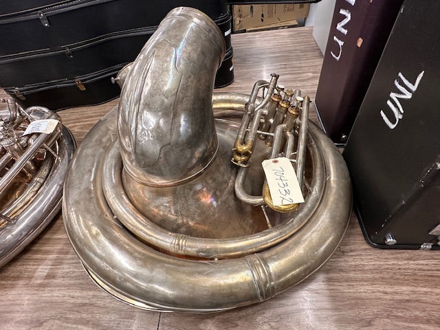 25 1/2″ King Musical Instruments USA Sousaphone from the University of Nebraska Band Dept. There is NO mouthpiece or case included.
